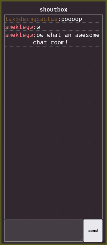 - The backend for the chatbox and future comment system is a web server I wrote in rust using the hyper and smol crates.